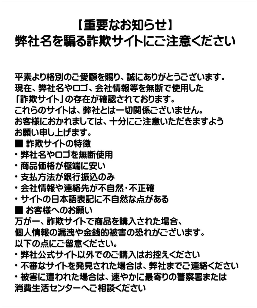 現在、弊社名やロゴ、会社情報等を無断で使用した「詐欺サイト」の存在が確認されております。これらのサイトは、弊社とは一切関係ございません。お客様におかれましては、十分にご注意いただきますようお願い申し上げます。